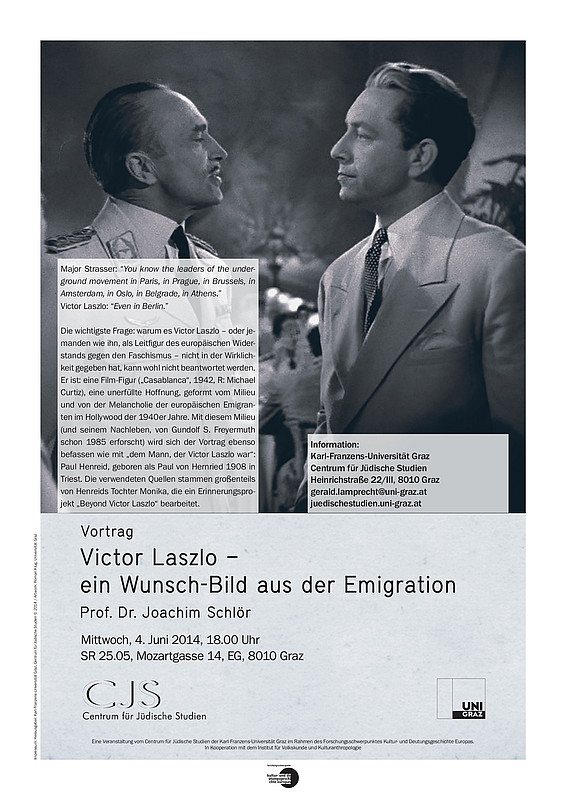 Die wichtigste Frage: warum es Victor Laszlo - oder jemanden wie ihn, als Leitfigur des europäischen Widerstands gegen den Faschismus - nicht in der Wirklichkeit gegeben hat, kann wohl nicht beantwortet werden. Er ist: eine Film-Figur ("Casablanca", 1942, R: Michael Curtiz), eine unerfüllte Hoffnung, geformt vom Milieu und von der Melancholie der europäischen Emigranten im Hollywood der 1940er Jahre. Mit diesem Milieu (und seinem Nachleben, von Gundolf S. Freyermuth schon 1985 erforscht) wird sich der Vortrag ebenso befassen wie mit "dem Mann, der Victor Laszlo war": Paul Henreid, geboren als Paul von Hernried 1908 in Triest. Die verwendeten Quellen stammen großenteils von Henreids Tochter Monika, die ein Erinnerungsprojekt "Beyond Victor Laszlo" bearbeitet.