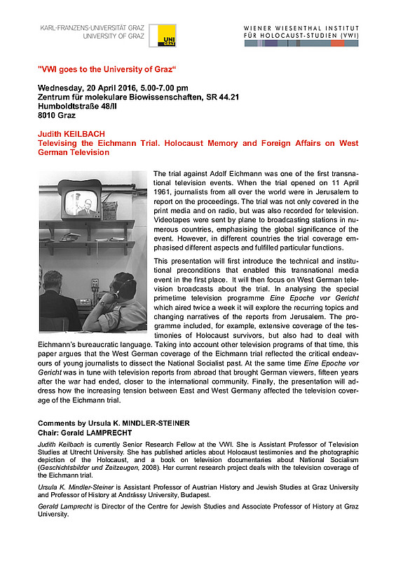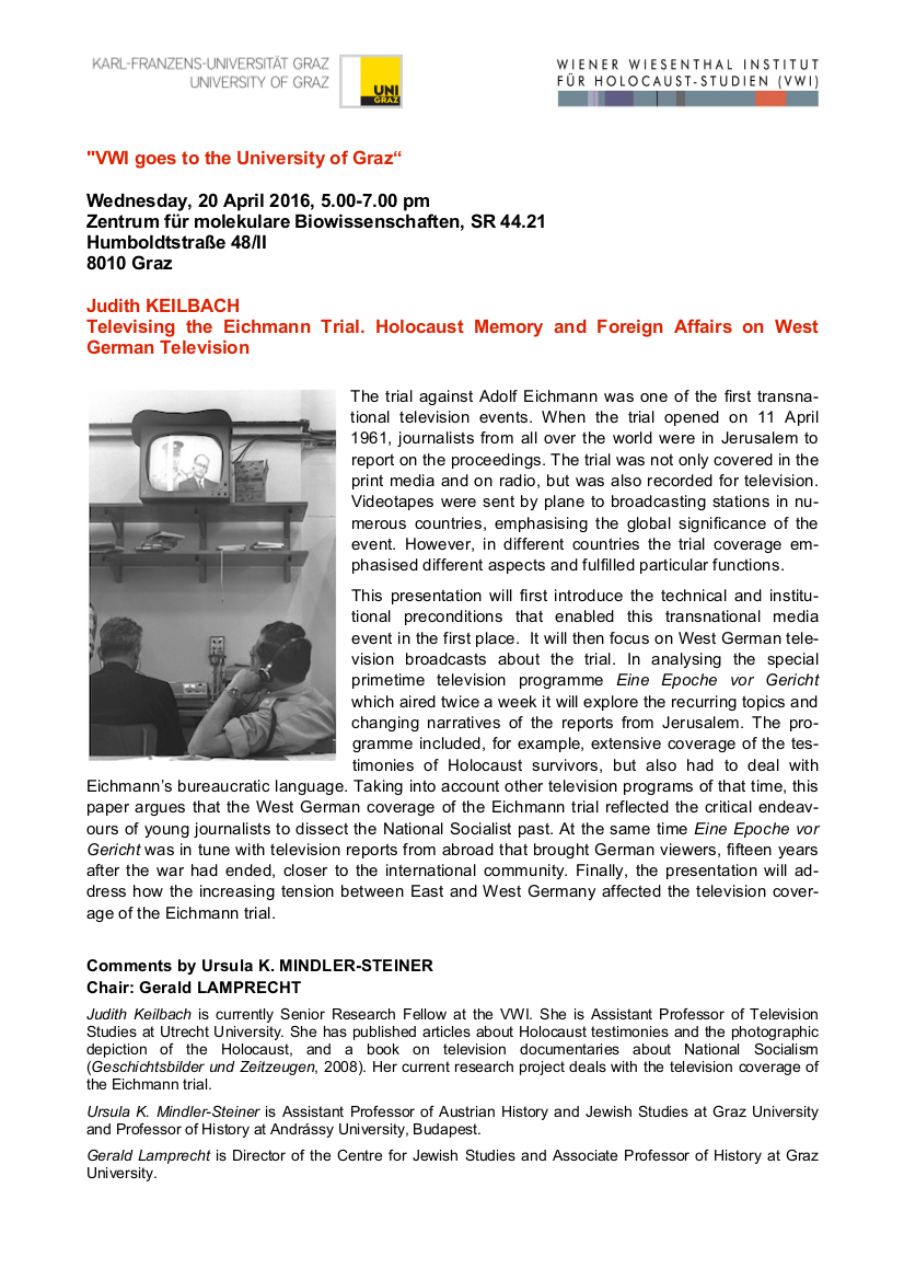 This presentation will first introduce the technical and institutional preconditions that enabled this transnational media event in the first place. It will then focus on West German television broadcasts about the trial. In analysing the special primetime television programme Eine Epoche vor Gericht which aired twice a week it will explore the recurring topics and changing narratives of the reports from Jerusalem. The programme included, for example, extensive coverage of the testimonies of Holocaust survivors, but also had to deal with Eichmann’s bureaucratic language. Taking into account other television programmes of that time, this paper argues that the West German coverage of the Eichmann trial reflected the critical endeavours of young journalists to dissect the National Socialist past. At the same time Eine Epoche vor Gericht was in tune with television reports from abroad that brought German viewers, fifteen years after the war had ended, closer to the international community. Finally, the presentation will address how the increasing tension between East and West Germany affected the television coverage of the Eichmann trial.