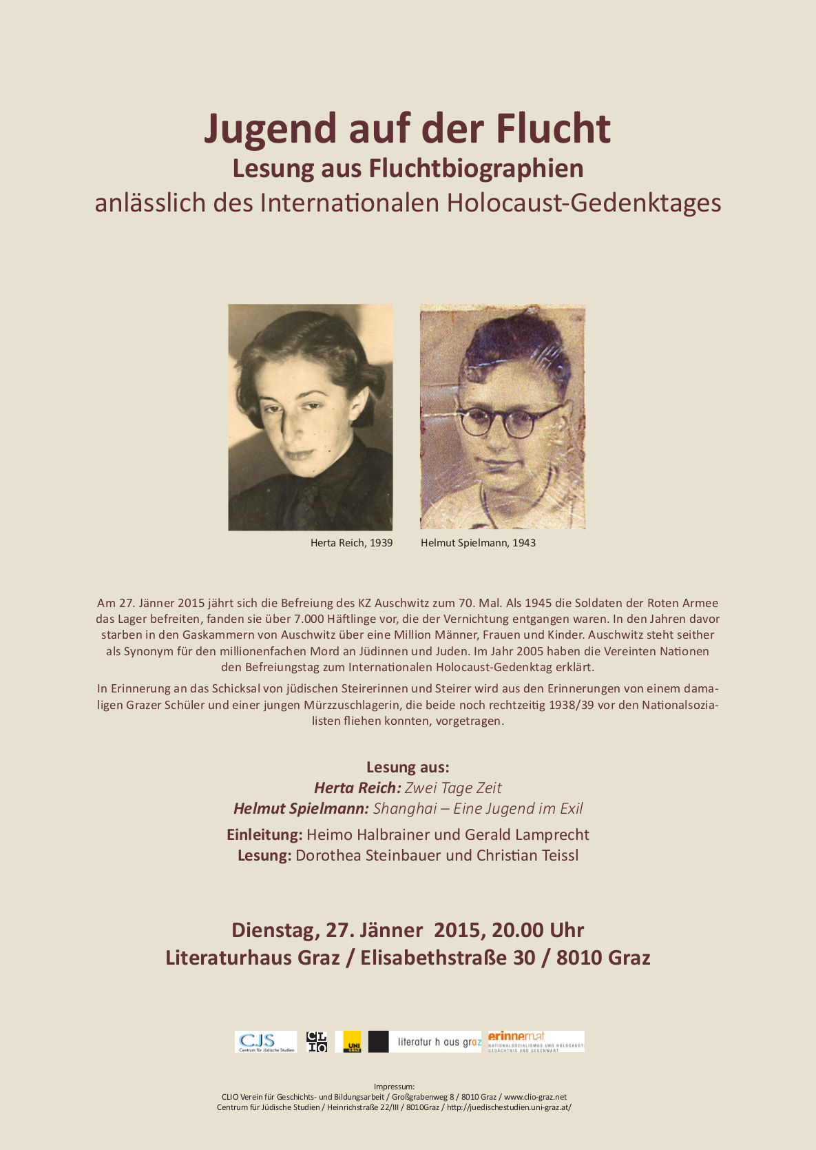 Im Jahr 2005 haben die Vereinten Nationen den Befreiungstag zum Internationalen Holocaust-Gedenktag erklärt. In Erinnerung an das Schicksal von jüdischen Steirerinnen und Steirer wird aus den Erinnerungen von einem damaligen Grazer Schüler und einer jungen Mürzzuschlagerin, die beide noch rechtzeitig 1938/39 vor den Nationalsozialisten fliehen konnten, vorgetragen.