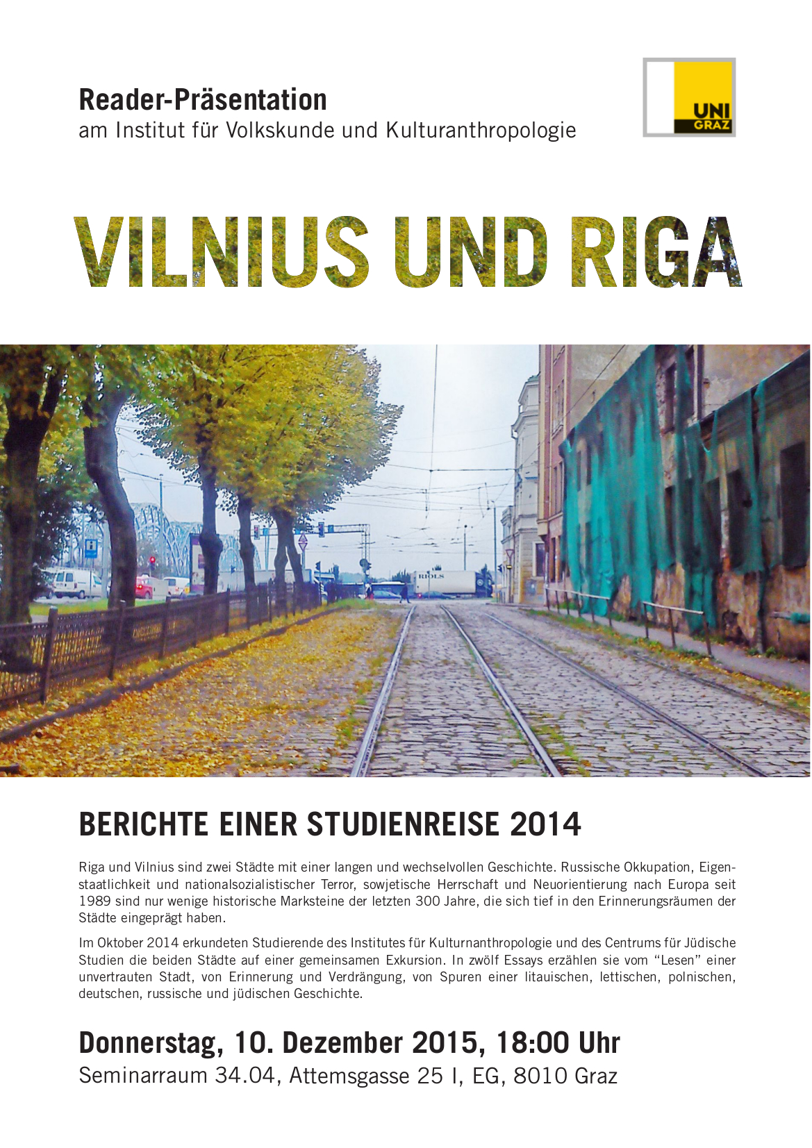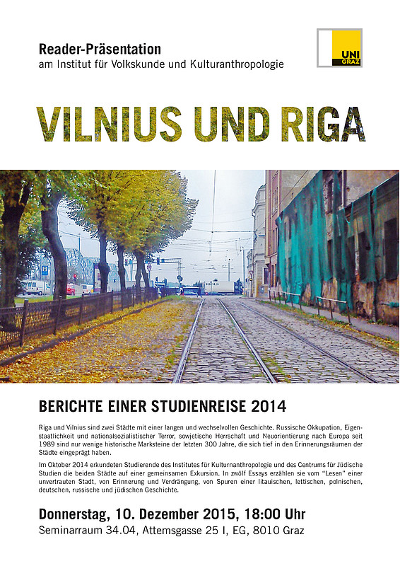 Im Oktober 2014 erkundeten Studierende des Institutes für Kulturnanthropologie und des Centrums für Jüdische Studien die beiden Städte auf einer gemeinsamen Exkursion. In zwölf Essays erzählen sie vom “Lesen” einer unvertrauten Stadt, von Erinnerung und Verdrängung, von Spuren einer litauischen, lettischen, polnischen, deutschen, russische und jüdischen Geschichte.